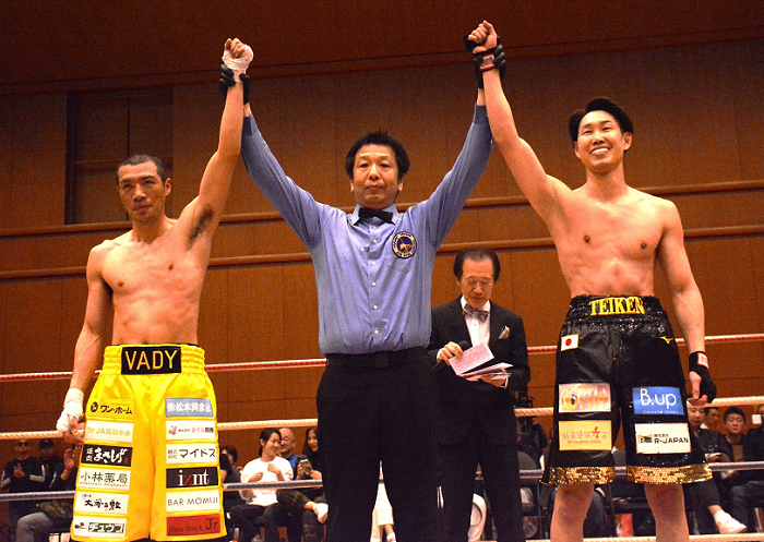 セミの前に元日本ライト級王者、西谷和宏(VADY)の引退式が行われた。元東洋太平洋同級王者の中谷正義さんと2ラウンドの記念スパーリング、VADYジムを応援するシドニー五輪柔道銀メダリスト、篠原信一さんらから惜別の言葉を受けた。