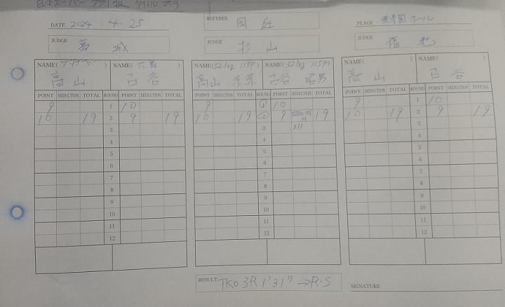 3回、高山がボディへの左ストレートから右フックでダウンを奪うと、立ち上がった古谷に襲いかかり、最後は右フックで崩れた古谷を主審が救った。