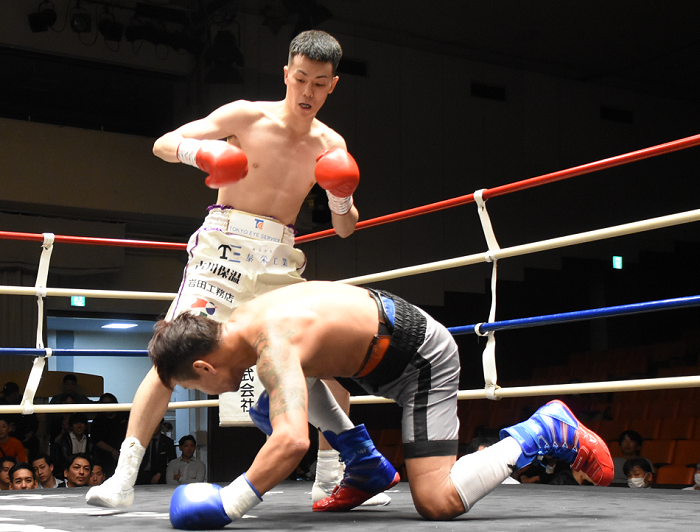 3回、石脇は前に出て湯場にロープを背負わせる。湯場もボディ打ちを決めるが、打たれ強さは石脇が上だ。攻める石脇が右を決めると湯場がダメージを負い、石脇が畳みかける。湯場は何とかここをしのいだ。しかし4回、石脇が右フックで湯場をキャンバスへ。立ち上がった湯場を攻め、今度は左フックで2つめを追加。最後は右で3度目奪ってフィニッシュした。