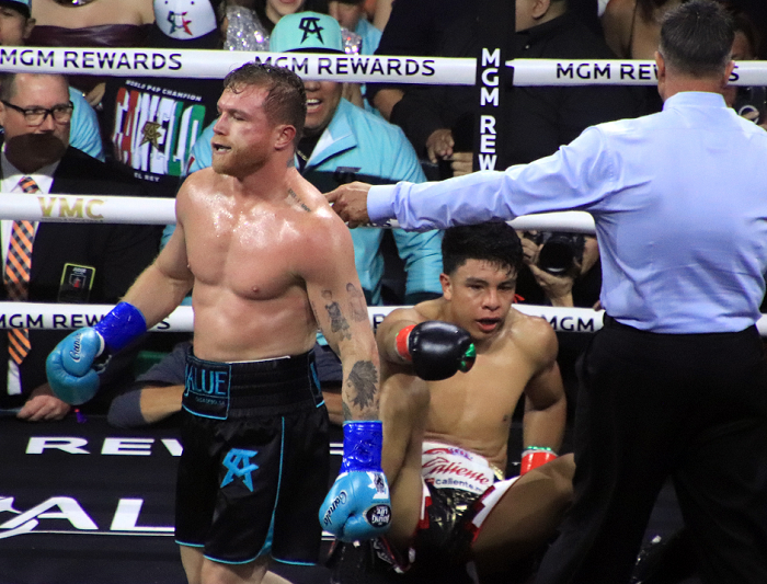 しかし4回、距離を詰めたカネロは右アッパーで効かせてムンギアをキャンパスに落下させる。ペースを引き寄せた統一王者は中盤、左を上下に浴びせ、右ボディーなどで優勢に進める。ムンギアも懸命にパンチを返すが序盤のような勢いはなく、カネロにかわされる場面が多い。