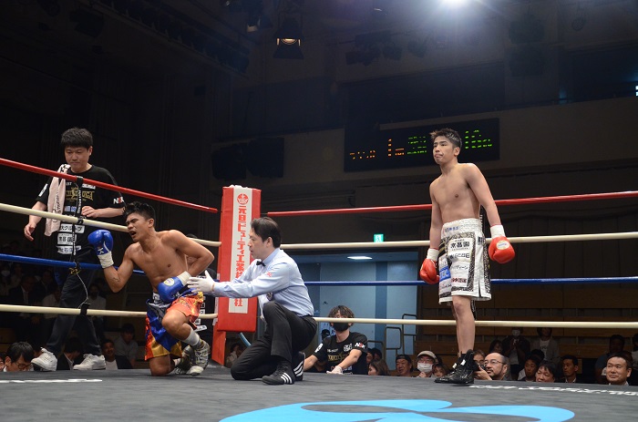 元東洋太平洋、日本王者で現在日本10位のサウスポー和氣が圧力をかけ、15センチ背の低いプラティップは打ち終わりに右スイングを狙った。2回早々、和氣の左カウンターでプラティップがダウン。和氣は2度目を追加すると、最後は強烈な左でプラティップを沈めた。