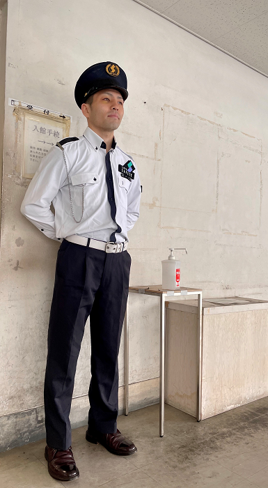 続いて阿久井は警備員の制服に袖を通し、約5年ぶりに同店での関係者出入り口で警備の業務に。「社会人になって初めて勤務した地で、当時緊張しながら(店内の巡回警備で)中を通ったのを思い出しました」と懐かしんだ。