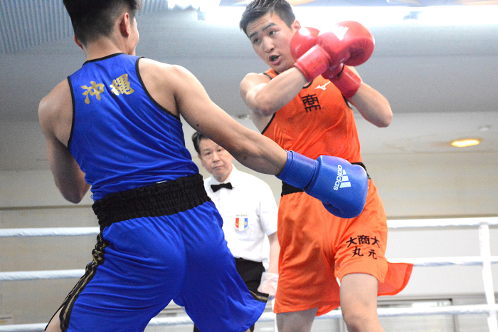 フライ級は芦屋大の與座力希夏(2年)が打ち勝ち、バンタム級は大阪商大の浅井陸(3年)が芦屋大の主将、西原柊吏(4年)を手数で圧倒した。続くライト級、柴田錬(4年)、L・ウェルター級、丸元大五郎(4年)が強さを際立たせた。芦屋大はウェルター級、L・ミドル級でポイントをあげたが、ミドル級は大商大の川村陸(2年)が青木大陽(1年・相生学院高)に競り勝ち、6-3でリーグ初戦を勝利した。