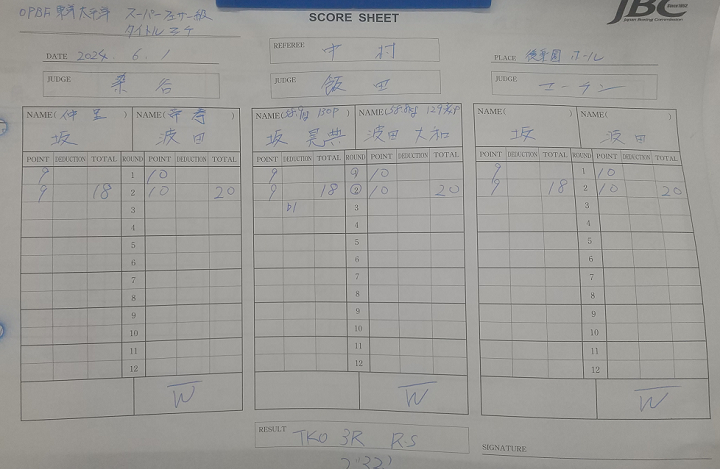 波田は坂のプレスをフットワークでしのぎながら、左ストレート、右フックを当てて試合を進めた。3回、坂が攻勢に出たところで、波田の右フックが炸裂、坂がフラフラとなり、ダウンが宣告された。再開後、坂のダメージは深く、波田が畳みかけたところで主審が坂を救った。