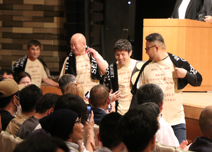 阿久井や守安竜也会長が勝利の報告を行うとともに、グッズ類の当たる抽選会や地元アーティストの熱唱ライブなど、イベント的な要素も盛り込んで進行。会の終盤に祝勝の記念品が次々と贈呈され、受け取った阿久井は「次は王座統一に向けて頑張りたい」と新たな目標も掲げていた。