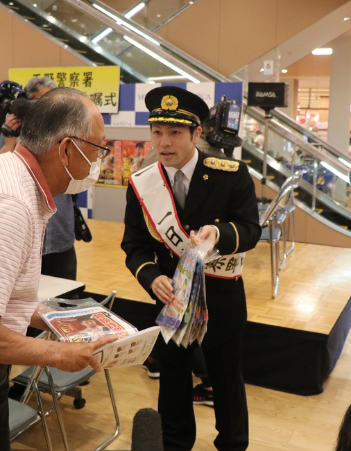 その流れで一日署長へと話が進み、市内の大型スーパーで委嘱式を実施。同署の東賢治署長からタスキをかけられた”阿久井署長”は「僕の初防衛成功には多くの方の協力があってからこそだが、でも最終的にそれを実行したのは自分自身。なので特殊詐欺から身を守るのも、最終的には自己の防衛意識です」などと説得力のある訓示を集まった市民らに行った。