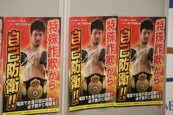 5月に初防衛を果たした岡山在住のWBA世界フライ級王者、ユーリ阿久井政悟(倉敷守安)が、相変わらずのご当地ヒーローぶりだ。警察署から特殊詐欺撲滅のポスターに起用され、12日には一日署長として広報活動にも参加。13日には祝賀会を催され、多忙ながら充実したチャンピオンライフを過ごしている。また、新たな表彰も決定した。