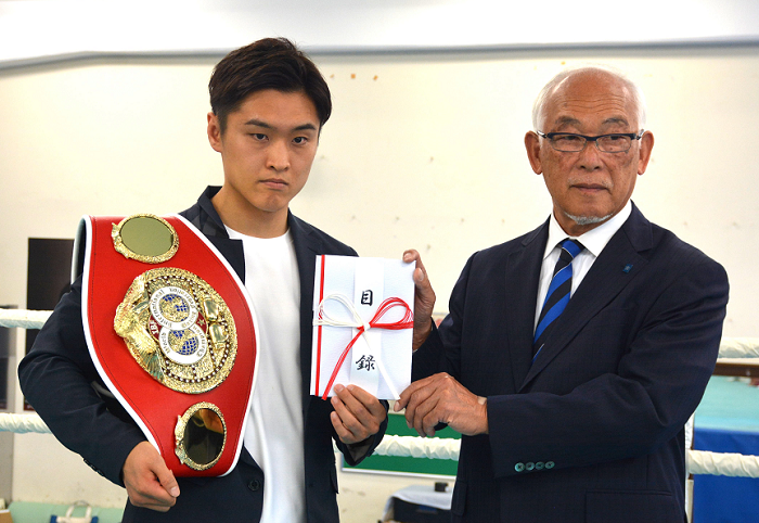新しいチャンピオンベルトを持参した西田は「関西学生リーグ優勝が目標で(奈良・王寺工高から)近大ボクシング部に入部。4年生の時に優勝でき、しっかりがんばれば結果を残すことができることを学んだ。みなさんの応援のおかげで世界チャンピオンになることができました」とあいさつ。