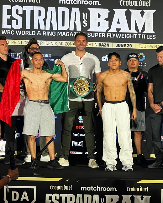 米アリゾナ州フェニックスのフットポイント・センターで明日29日(日本時間30日)開催されるWBC・S・フライ級タイトルマッチの計量が28日行われた。王者フアン・フランシスコ・エストラーダ(メキシコ)、挑戦者ジェシー“バム”ロドリゲス(米)ともリミットの115ポンド(52.16キロ)をマークし無事に合格した。