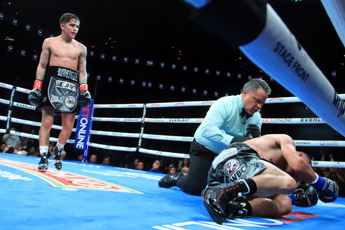 4回、拮抗した攻防からロドリゲスが左アッパーで効かせ、左を追撃するとエストラーダは自軍コーナー付近にダウン。5回、ダメージが残る王者にロドリゲスは左強打を中心に激しくチャージ。優勢を印象づける。