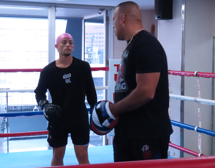 公開練習ではシャドーボクシングとミット打ちを2ラウンドずつ。練習を見守った粟生隆寛トレーナーは「雰囲気として勝てるという感覚は出てきた。ヤファイを倒した右、近い距離の左フックに気をつけて、できるだけ近い距離に入らずに組み立てたい」と試合をイメージした。