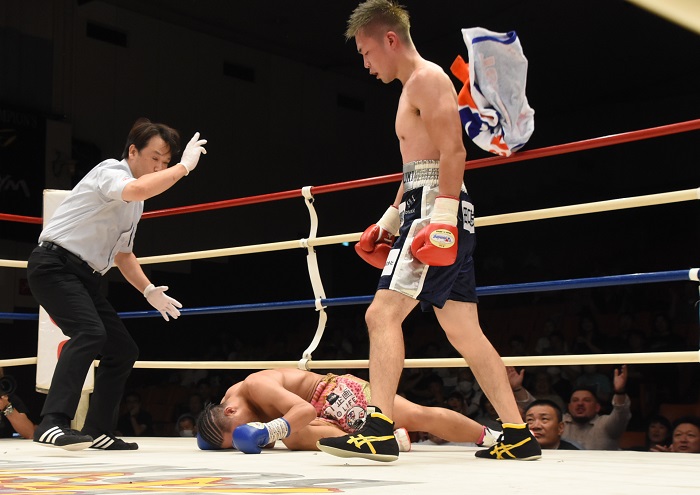 ワランチャイを再度倒した落合㊧の左ボディー