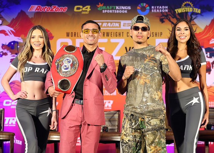 ゴールデンボーイ・プロモーションズ(GBP)が日本時間11日にラスベガスのマンダレイベイ・リゾート&カジノで開催するイベントの最終会見が8日行われた。メインではWBC・S・ウェルター級暫定王者セルヒイ・ボハチュク(ウクライナ)がバージル・オルティスJr(米)の挑戦を受ける。PHOTOS/CRIS ESQUEDA(GBP)