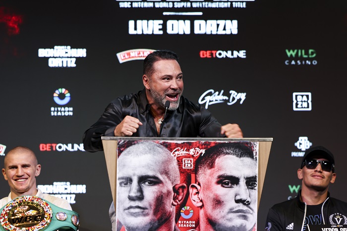 ゴールデンボーイ・プロモーションズ(GBP)が日本時間11日にラスベガスのマンダレイベイ・リゾート&カジノで開催するイベントの最終会見が8日行われた。メインではWBC・S・ウェルター級暫定王者セルヒイ・ボハチュク(ウクライナ)がバージル・オルティスJr(米)の挑戦を受ける。PHOTOS/CRIS ESQUEDA(GBP)