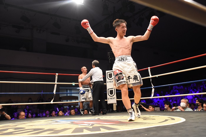 21日のセミで行われたバンタム級8回戦は、伊藤千飛(いとう・せんと、真正)がラン・コウコウ(中国)を終始スピードとテクニックで圧倒。最終8回1分16秒、レフェリーストップによるTKO勝ちで2戦2勝2KOとした。