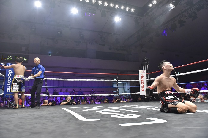 そして7回。松本が右フックを叩きつけると森が両グローブをキャンバスに着くダウン。再開後、松本がワンツーストレートを立て続けに決めると、レフェリーが森の体を抱えてストップした。
