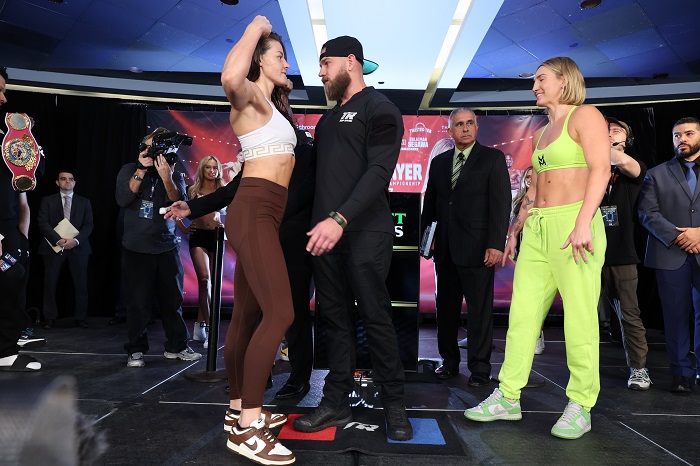 現地時間27日、トップランクがニューヨーク・マジソンスクエアガーデンのザ・シアターで開催するイベントの計量が26日行われた。メインのWBO女子ウェルター級タイトルマッチはチャンピオンのサンディ・ライアン(英)が146.6ポンド(66.50キロ)、挑戦者ミカエラ・メイヤー(米)が146.8ポンド(66.59キロ)をマーク。リミットの147ポンドに合格した。photos/Mikey Williams(Top Rank)