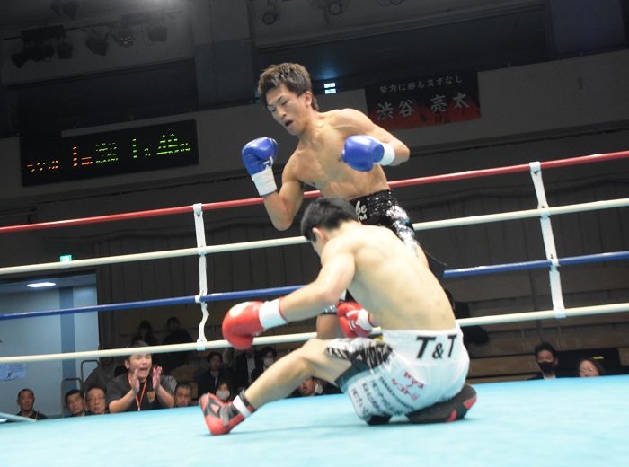 一昨年の新人王トーナメントで渋谷は東日本、高埜は(西軍代表)の決勝で敗れ全日本新人王決定戦に出場できなかった同士の対決である。初興行のメインカードに抜てきされた渋谷は、7月に現日本11位の印波優心(レイスポーツ)に敗れて以来の再起戦だったが、スタートから積極的に出て手を出した。