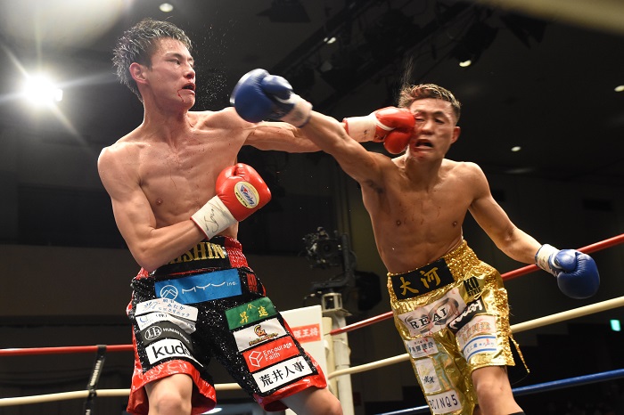 軽いフットワークと速いテンポの攻撃で先制したのは大橋だったが、側頭部同士がぶつかる偶然のバッティングが起きてしまい大橋がダウン。ダメージは深かったが、数分間の休憩後は回復を見せ、再び先手で仕掛ける。川満は被弾しながらも勢いに飲まれまいと距離を詰めて連打。早くも打ち合いの展開となった。