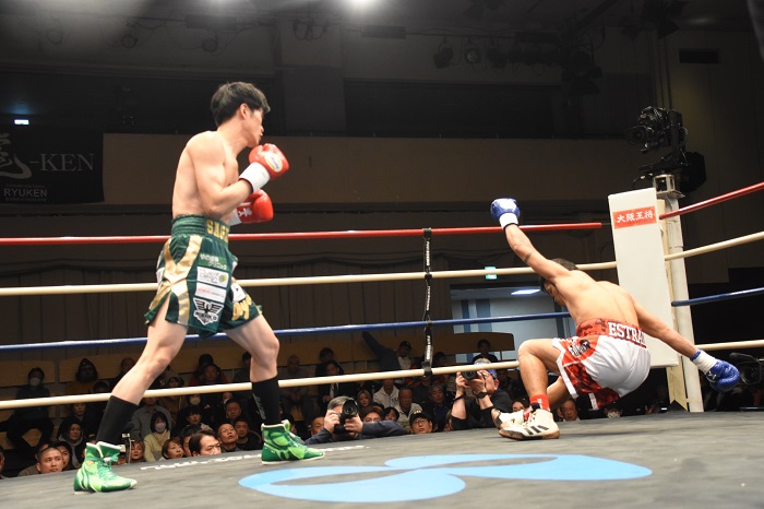 2回、回転力に優る大橋が右アッパーをうまく混ぜながら猛烈に連打していくが、川満は左右ボディーを決めて押し戻し、大橋が右を空振りしてガラ空きとなったアゴへ左フックをカウンタ―。腰を落としかけた大橋を、川満は一気に攻め立てる。大橋も必死に反撃を試みたものの川満が右をジャストミート。ガックリと倒れかけた大橋をレフェリーが抱き止めた。