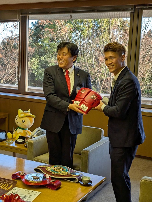 これに小野塚市長も「さらなる高みを目指して頑張ってください」と激励。渡辺均会長は「あと何戦か挟んでランキングをアップするとともにキャリアもつけ、ライト級という簡単ではない階級ではありますが、チャンスを作っていきたい」と語った。