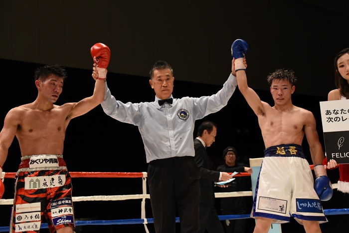 もうひとつの8回戦では、日本ライトフライ級4位の井上彪(六島)がノーランクの木村彪吾(グリーンツダ)と激しい打撃戦を展開。最後までシーソーゲームのように手を出し合った末、三者三様の引き分けとなった。