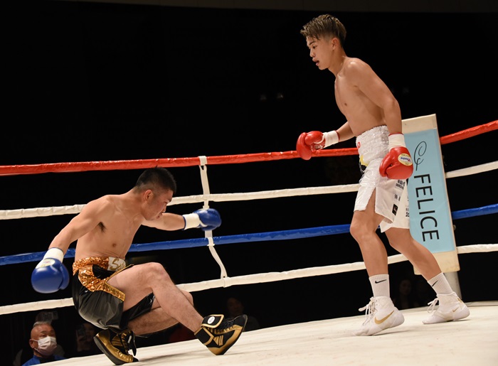 韓(26歳)は昨年の全日本社会人フライ級王者からプロ転向した期待の選手。ジムの先輩、西田凌佑と同系のサウスポーの技巧派で、この日も立ち上がり右のリードをビシッと決めて快調にスタートを切った。この回終盤には偶然のバッティングで韓は右目上をカットし出血するアクシデントもあったが、次の2ラウンドには左ストレートのカウンターを決めて近藤を派手にひっくり返した。