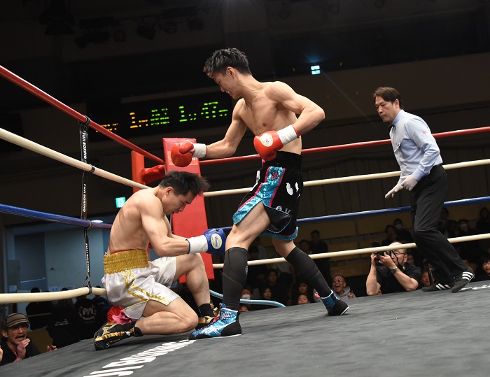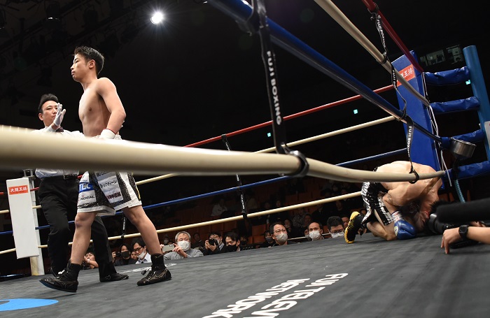 森を苦しめたラフファイトに巻き込もうとしたファンだが、足を踏まれた大胡は即指摘してファンを牽制。右の相打ちをカウンターで決めて効かせると、一気にワンツーをまとめてファンを倒す。立ち上がったファンのダメージを見て、レフェリーが試合を止めた。