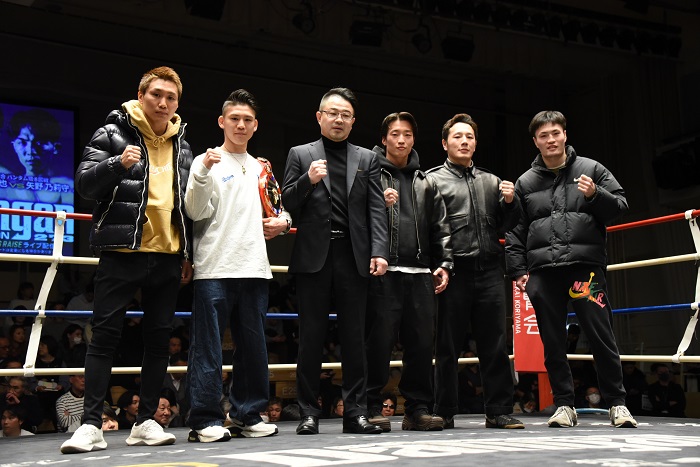 「アウェーでチャンピオンになったけど調整試合なんかしたくもなかった。今日もいい経験になった」と中井。角海老久々の興行で大役を任されたことも意気に感じて「この環境に感謝します。この階級で世界を獲りたいし、そこまではいばらの道であっても全部乗り越えていきます」とさらにやる気になっていた。