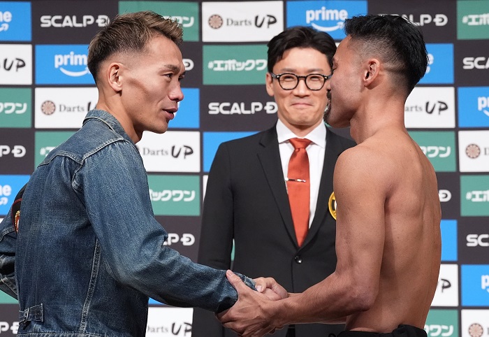 明日24日(月・祝)開催される『PRIME VIDEO BOXING11』(東京・有明アリーナ)の世界バンタム級(リミット118ポンド=53.5kg)ダブルタイトルマッチ前日計量が23日に都内で行われ、WBC王者・中谷潤人(M.T)が53.3kg、挑戦者6位ダビ・クエジャール(メキシコ)が53.2kg、WBA王者・堤聖也(角海老宝石)が53.5kg、挑戦者4位・比嘉大吾(志成)が53.4㎏で一発クリア。また、119ポンド(53.9㎏)契約10回戦に出場のWBOアジアパシフィック・バンタム級王者・那須川天心(帝拳)、前WBOバンタム級王者ジェイソン・マロニー(豪)はともにリミットの53.9㎏で1回でパスした。photos/Naoki Fukuda