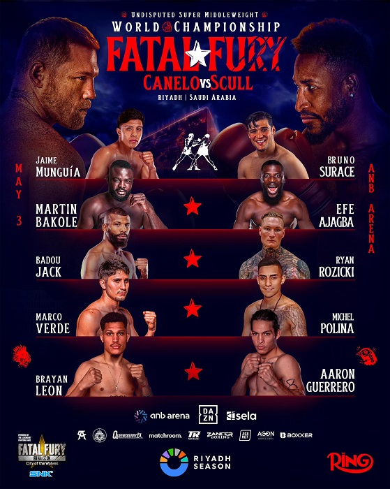 5月3日サウジアラビア・リヤドのANBアリーナで行われるサウル“カネロ”アルバレス(メキシコ)vs.ウィリアム・スクール(キューバ)のS・ミドル級4団体統一戦のアンダーカードが17日、正式に発表された。イベントはサウジアラビア政府直轄プロジェクト「リヤド・シーズン」の一環として開催される。