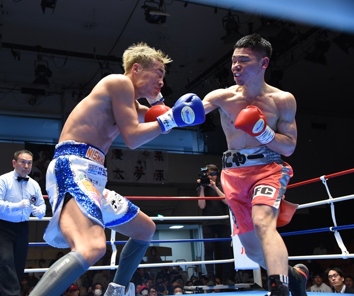 だが、西畑はひたすら連打を繰り出して川口に手を出させなくする。また、川口は右拳でも痛めたのか、右ブローをめっきり出さなくなっていった。それでも要所で左ボディーカウンターや左ジャブをヒットした川口が、西畑に完全にペースを渡すことはなかった。最終回、川口はアッパー、フックと右をふたたび強く打ち出して西畑のバランスを崩させ、勝利を決定づけた。川口は10勝6KO1分。西畑は9勝6KO2敗。