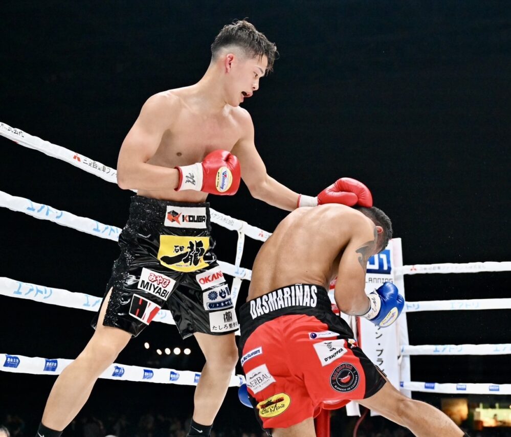 ダスマリナスが圧力を強め、岡本にロープを背負わせると左右ボディー連打。岡本の足が止まり始めると、ダスマリナスの左アッパーから右フックのボディー連打が目立ち始める。しかし5回、低い姿勢からダスマリナスが左ボディーを狙う刹那、岡本の右打ち下ろしがヒット。前のめりに倒れたダスマリナスを見て、レフェリーがノーカウントで試合を止めた。