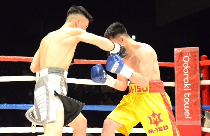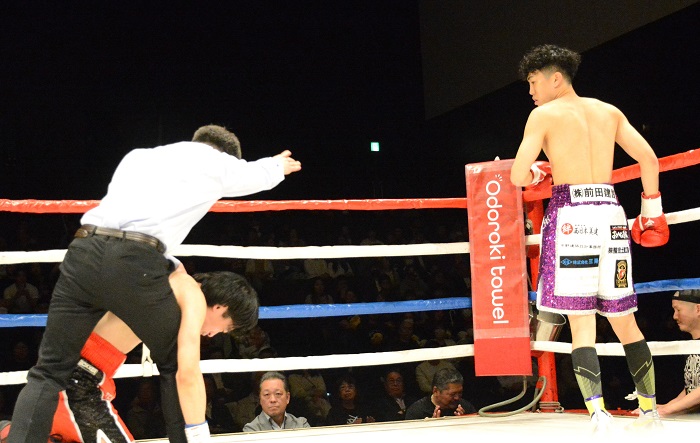 試合は挑戦者京原がのっけから飛ばし、国本にガードの時間を強いた。積極的に左右ブローを叩き続ける京原に対し、国本は攻めに転じるチャンスを伺いながら防戦。しかし2回、京原が左サイドへと回りながら放った右に国本も右を合わせ打ちすると、これがジャストミートして京原は背中からキャンバスに沈んだ。