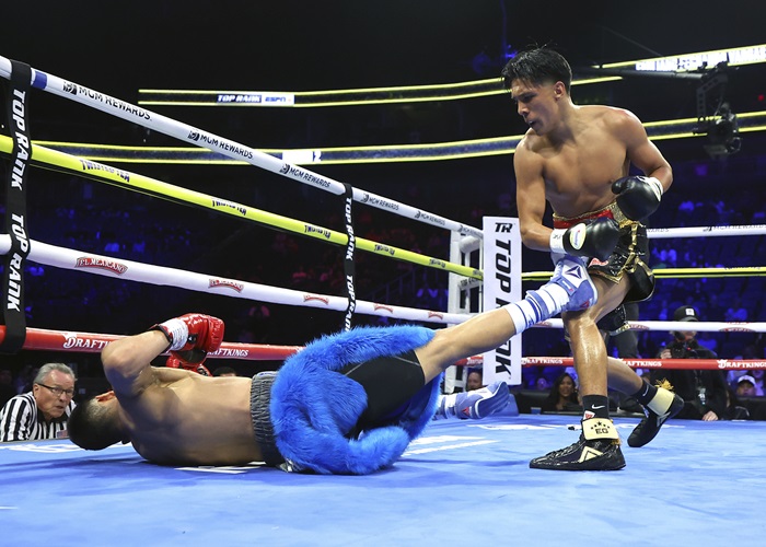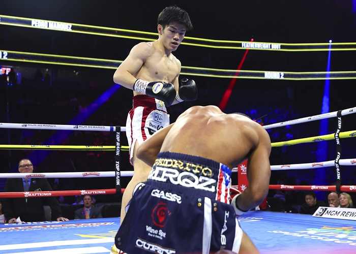 4日(日本時間5日)ラスベガスのT-モバイルアリーナのリングに上がったOPBFフェザー級チャンピオンの中野幹士(帝拳)は元WBO北米王者のペドロ・マルケス(プエルトリコ)に4回1分58秒TKO勝ち。計5度のダウンを奪い、上々の米国デビューとなった。Photos/Mikey Williams(Top Rank)