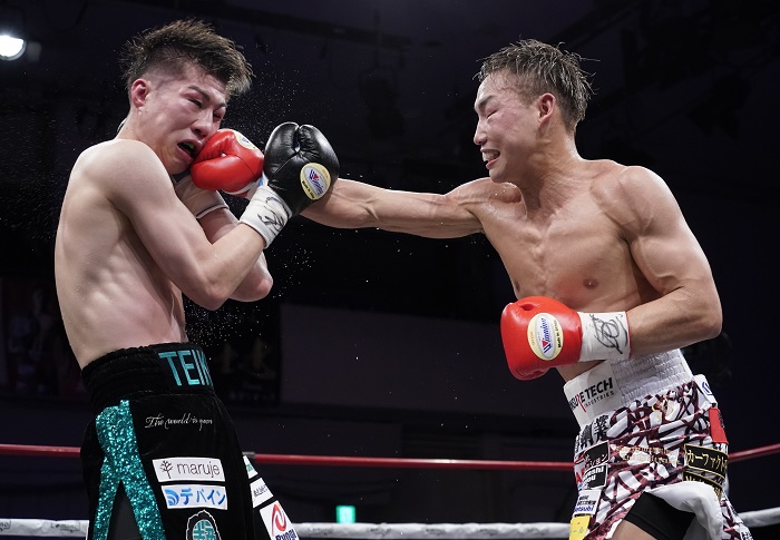 4月22日の王座獲得戦で福井に右ストレートを決める石井㊨