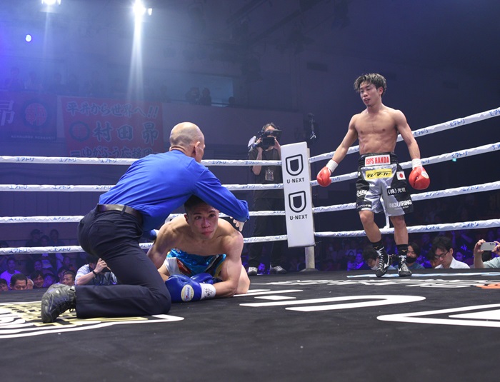 守りから攻めのステップワークへと転じた村田に対し、小國の足がついていかない。それでも左右ボディー攻撃で流れを変えようと迫った小國だが、村田のハイテンポは加速する一方。6回、村田が連打を決めると、小國も負けじと左ボディーカウンターを狙ったが、王者の左がヒットしてのけ反った小國をレフェリーが支えてストップした。