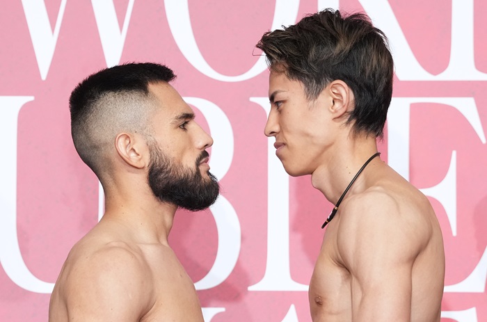セミのIBFスーパーフェザー級王座決定戦は、エドゥアルド・ヌニェス(メキシコ)が58.7キロ、力石政法(大橋)が58.8キロでクリアした。フェイスオフではヌニェスと力石が静かに闘志を戦わせた。「僕も向こうもこの日のためにやってきているので、昂るのは当然」と力石。