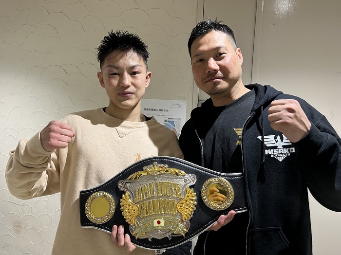 中垣戦後、ユースのベルトを手に丸山有二トレーナー(右)と