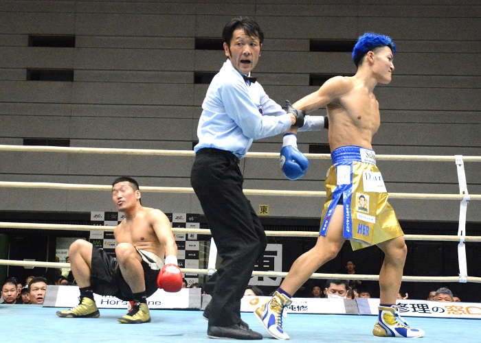 しかし4回、佐野は狙っていた左ボディーカウンターを決めてタガカナオの体をくの字に折ると、以降は左ジャブを使ってコントロール。ボディーカウンターを警戒するタガカナオは右スイングを控え、すっかり攻め手がおとなしくなってしまった。