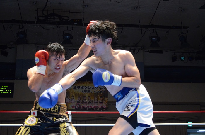 前戦で足名優太(金子)を破り、日本ランク入り(13位)した多破を、右クロス、左ボディ一を放って金子が追う。3回には多破をロープへと追い、右を効かせた。