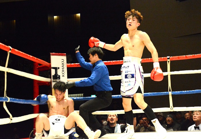 セミのフライ級8回戦は日本フライ級2位、小坂駿(30=SUN-RIZE)が新鋭・弘田一誠(23=モリシタ)の左フックから右を受けて、3回TKO負け。昨年の新人王フライ級西軍代表の弘田はパンチ力を生かし、A級初戦でランカーを撃破した。弘田は7勝3KO1敗1分、小坂は20勝4KO11敗1分。
