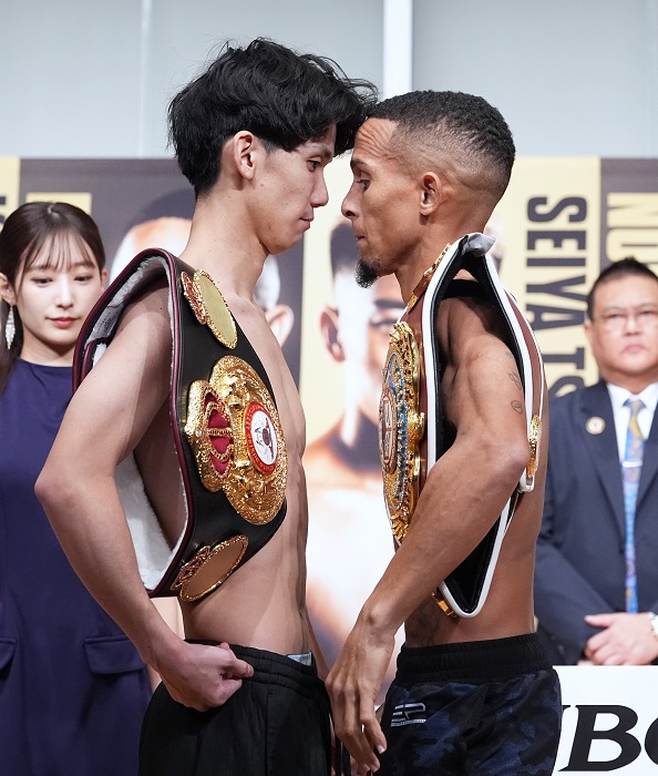 ライトフライ級の統一戦はWBA王者高見亨介(帝拳)が48.8キロ、WBO王者レネ・サンティアゴ(プエルトリコ)が48.7キロ。鬼門の計量をクリアした高見は「やりました、本当に」と第一声。フェイスオフの際にサンティアゴがグッと近づいてきたが、動じるところは見せなかった。あすのサンティアゴは果たして近づいてくるかどうか。