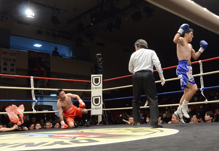 いきなり接近してパワフルな左右フックを見舞うサウスポー石井。福本は退かずにしっかりとカバーして右アッパーの連打を上下に突き上げる。頻繁にサウスポーにスイッチする福本が右フックをヒットするが、3回は石井が左右アッパーを突き上げて福本の左目上を切り裂く。石井の強打に対し、福本も接近戦で右アッパーをボディーに差すものの、4回から石井はサークリングもまじえてアングルを変える巧さを披露。5回、石井が右フックから左オーバーハンドを立て続けにヒットするとレフェリーが福本を抱えた。
