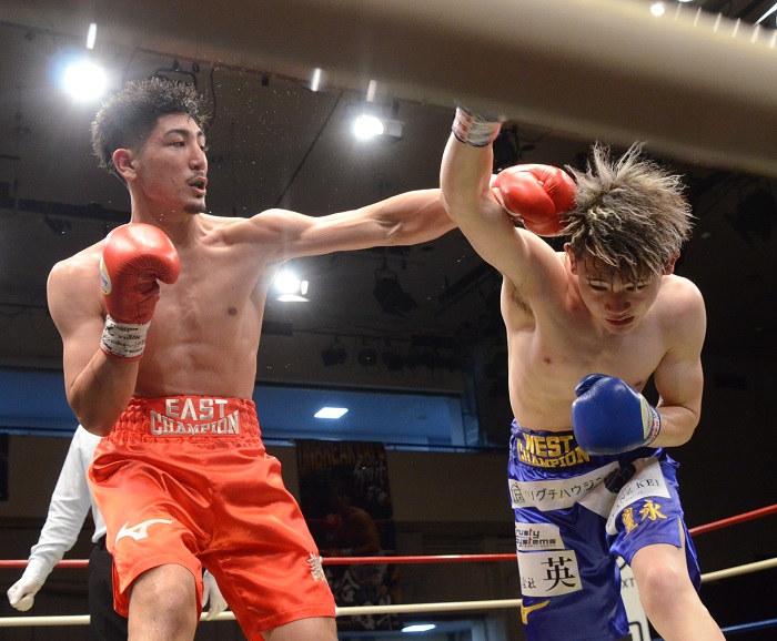 西軍代表戦MVPの光富がブロック主体の防御から、軸をブレさせず左ボディー、ストレート攻撃で好スタート。しかし、菅谷がラフな連打をガード上から叩きつけて徐々に打ち合いに巻き込んでいった。互いに左ボディーブローをクリーンヒットする展開で、圧倒的に手数で上回ったのは菅谷だが、間隙を突いた光富が評価された。