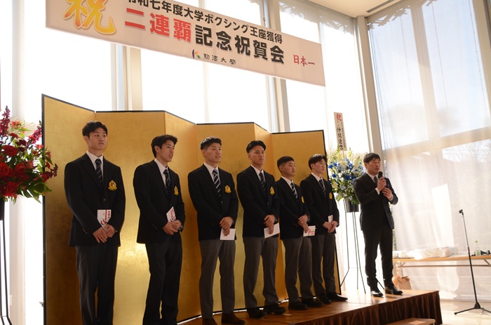 全日本大学王座と関東大学リーグ戦をそれぞれ2連覇した駒澤大学ボクシング部の祝賀会が1日東京・世田谷の深沢キャンパス内で催された。約百人が招かれ、にぎやかに同大ボクシング初の偉業を祝った。
