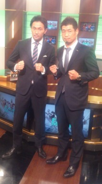 山中慎介(帝拳)と長谷川穂積(真正)の新旧世界チャンピオンが9日、東京・辰巳のWOWOW放送センターで、ゲスト解説をする「エキサイトマッチ」の収録に臨んだ。2人は来る4月23日に大阪でそろって世界戦に出場することが決まっている。長谷川がエキサイトマッチのゲスト解説を務めるのは約3年ぶりのことだった。