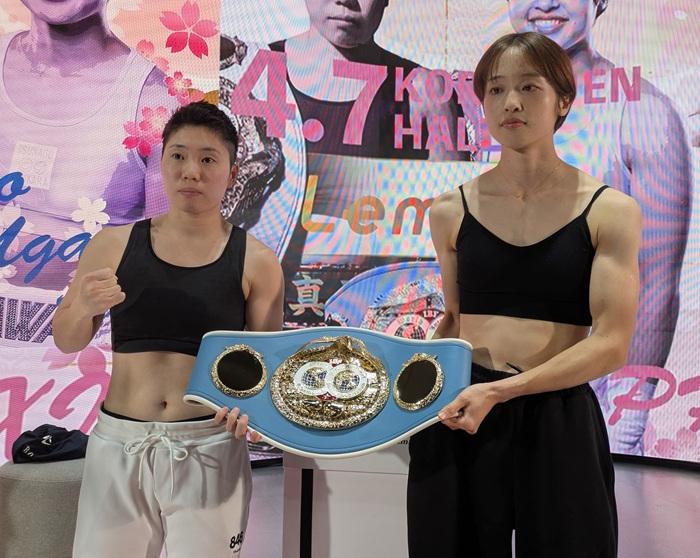 一方の鵜川(30歳)はこれが7戦目にして初の世界戦。「普通の試合と変わらず、やるべきことをやる」と言いつつ「やはり緊張している」と本音を明かした。日本バレーボール協会の職員でもある鵜川は「ここまで続けてこれたのは職場の人たちの理解があったから」と謝を口にした。また勝てば手に入る水色のIBF女子チャンピオンベルトを見て「大きくてかっこいい。勝って感謝を形にできればいい」とモチベーションを高めていた。山中は9勝3KO1敗、鵜川は6勝不敗。