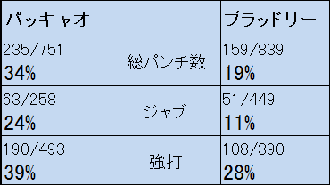 CONPUBOXの集計(上図)では、的中率はジャブ、強打ともにパッキャオが優勢という結果が出ている。HBOが後日「どちらが勝っていたか」という投票をインターネットで呼びかけたところ、パッキャオの勝ちに投票した視聴者が91%。ブラッドリーの勝ちは7%でドローが2%だった。ブラッドリーが勝ったと考えているのは、ブラッドリー陣営を除けば極めて少数と言えるだろう。