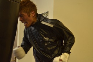 同門の4回戦選手、山口結人と4ラウンドのスパーリングを終えた佐藤は、サンドバッグ打ちを終えると、バイクを漕ぎながら集まった記者たちといつも通り談笑。プレッシャーとは無縁の表情だった。